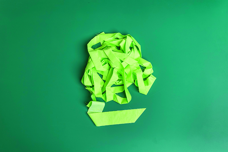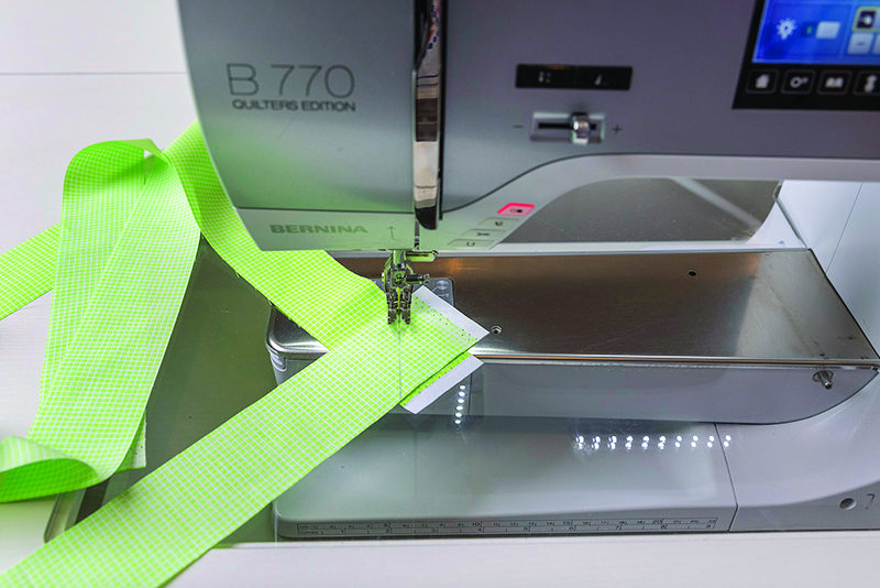 Step 4 – Join all the binding strips into one long continuous strip. Trim the excess triangles and press the seams open. Trim one end of the binding at a 45 degree angle. This becomes your starting ”tail.” Finally, press the binding wrong sides together all the way along the length.