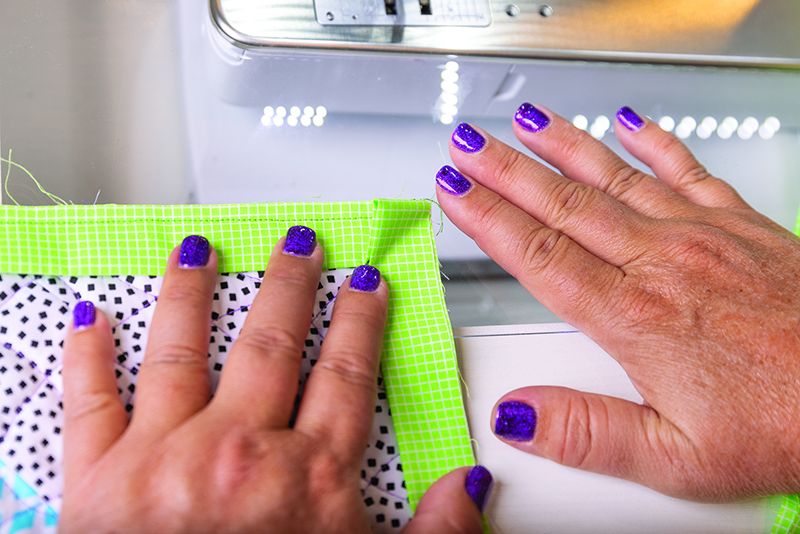 Step 2 – Begin stitching using 1/4” seam allowance. Use a walking foot or dual feed system if possible. When you get near a corner, stop and mark the stopping point, which is 1/4″ away from the corner, or stop stitching at the line on your presser foot that’s 1/4” away from the tip of the foot.