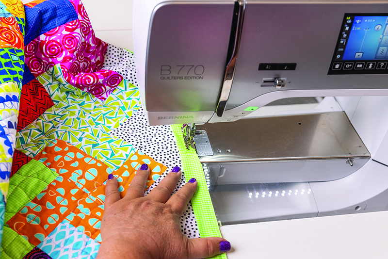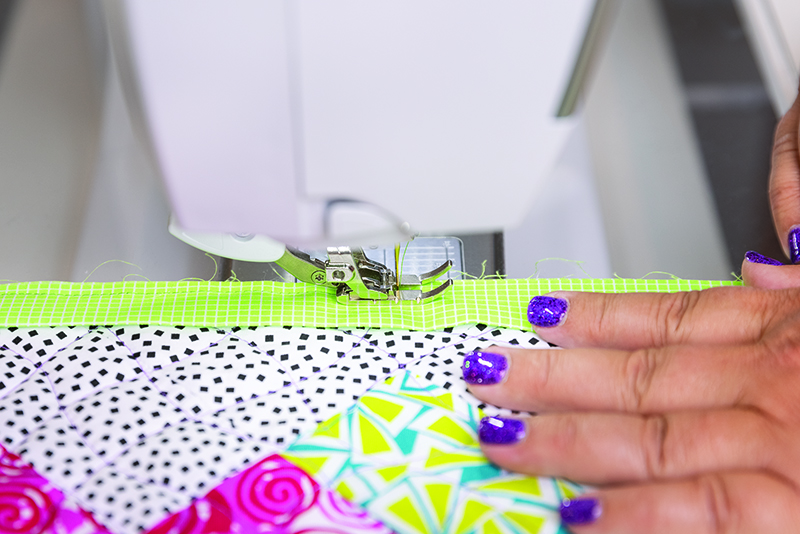 Starting anywhere on the right side of the quilt, pull up the bobbin thread to the quilt top. Set your needle position so that you will be stitching just to the right of the folded edge, onto the binding fabric. Hold the top and bobbin threads in place and stitch about 6-8 teeny tiny stitches to secure. Set your stitch length back to normal and stitch next to the folded edge all the way around the perimeter of the quilt. When you get to the corners stop with the needle in the down position and rotate the quilt to continue stitching. When you get back to your starting point, stitch on top of your previous line of stitches for about 6-8 teeny tiny stitches. Clip thread tails for a smooth finish.