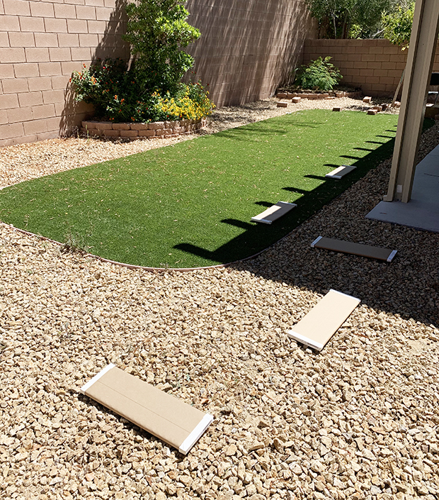 As we were finalizing the design, I used bricks from the yard and empty fabric bolts to visualize how big the areas of the pool would be. It was actually pretty fun to see my idea begin to take shape!