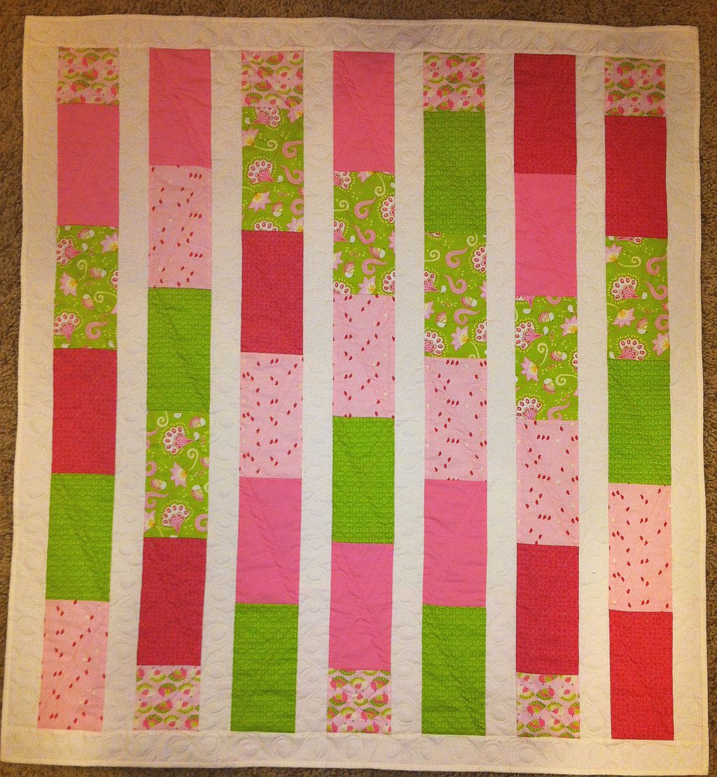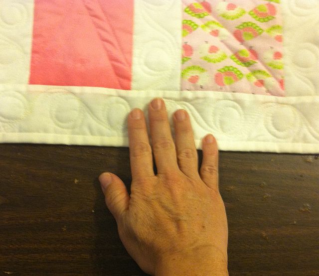 When I quilted this quilt, I marked all of the original straight lines, about 2″ apart. Then I filled in the rows of quilting between the lines using the edge of my foot as a guide. It’s totally not perfect, but I love it and hope it will go to a good home. π