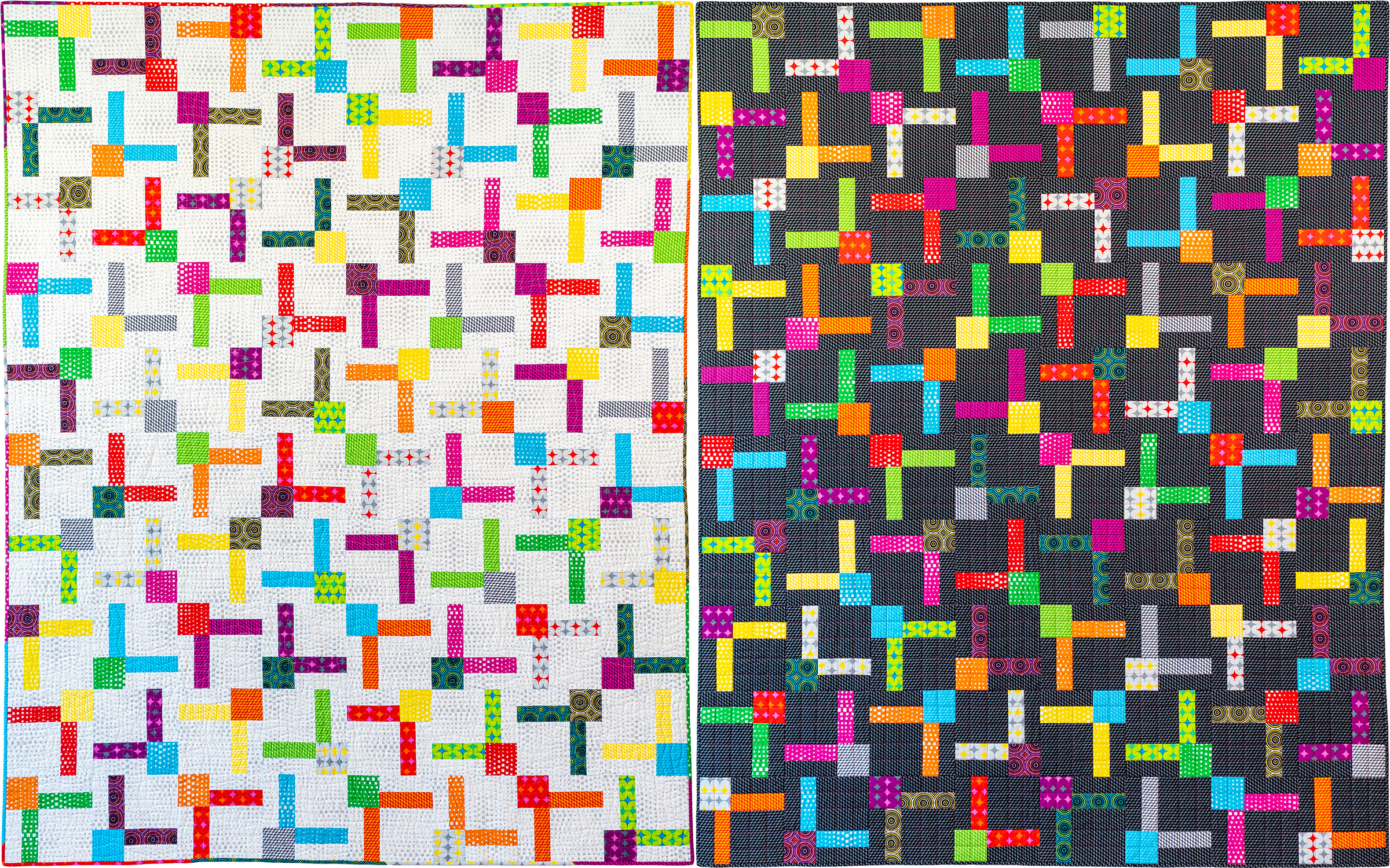 Once the pattern rights reverted back to me, I created a version of my Bling pattern that now includes multiple sizes. This time I made two more versions of Bling to showcase another colorful fabric collection I had designed. I wanted to demonstrate how the same bright fabrics can pop against either a very dark OR very light background as shown below: