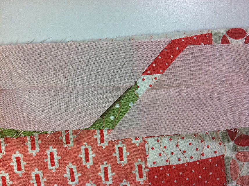 This method is called double-fold straight grain binding. Sew all of your strips together to make one continuous piece. Miter the strips by sewing on an angle to distribute the bulk of the seam. If you are using a solid fabric, be sure to sew them all together on the same side!