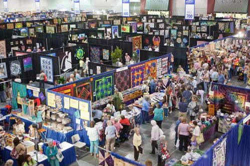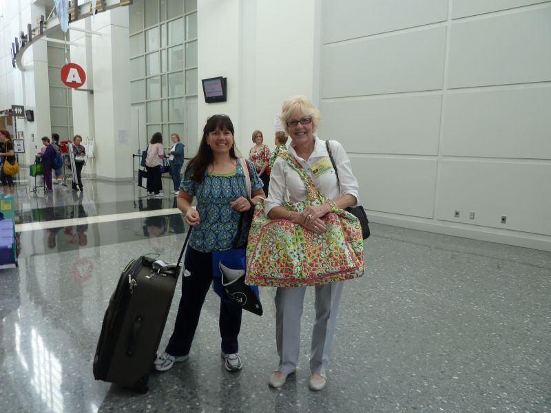 Here’s a photo of my friend Judy and me at the convention center on the first day. (Notice her adorable quilt bag made from Amy Butler Fabric. We are so eager! I think I need more quilt luggage or a least a trendy bag. I did get a couple of free bags from the show, though!
