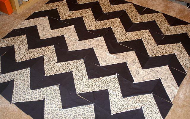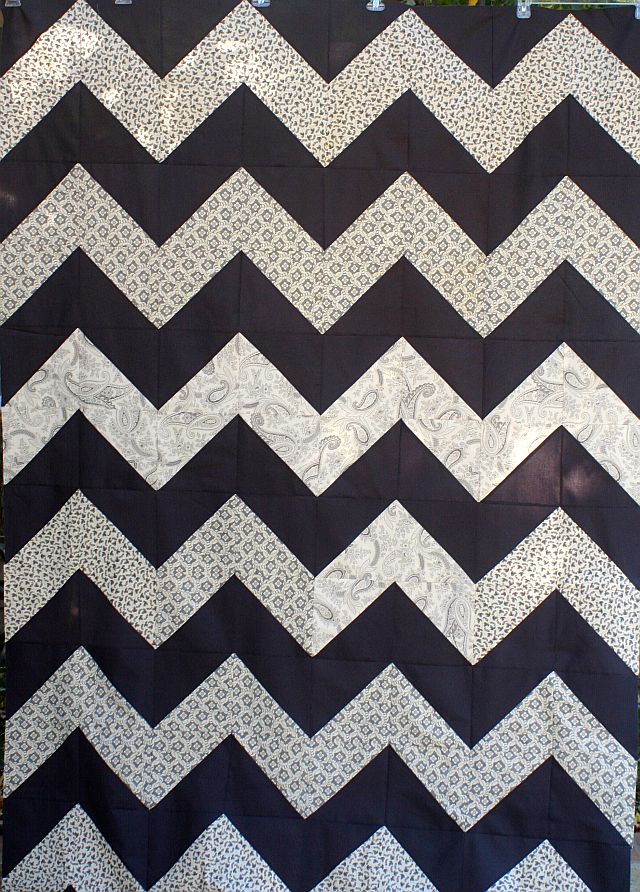 Kathie from California has worked ahead and has completed her lovely chevron quilt top in shades of black, white, and grey. She changed her quilt top up a little by sewing larger blocks and making her top narrower but longer.