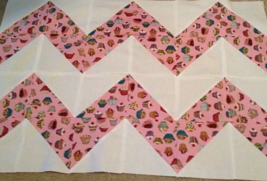 Finally, here’s the next chevron quilt Ellen is working on using a pink cupcake novelty fabric and solid white background. This time she cut her triangles from 6 inch squares to start with.