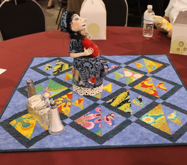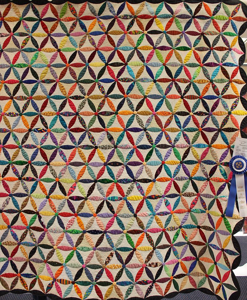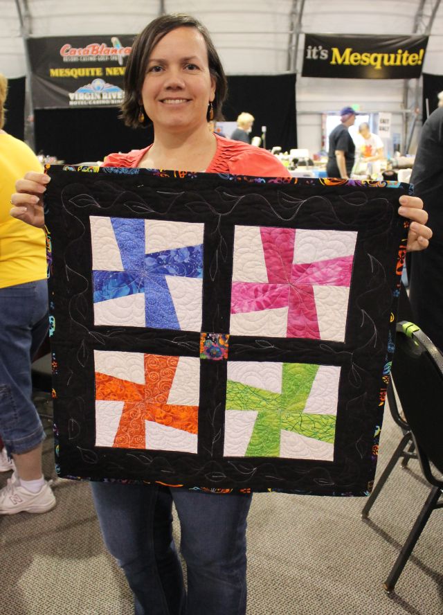 It’s always hard to get a good pic of quilts hanging in a show, due to lighting and space constraints, but I love how the quilting shows up in this picture. I was pleasantly surprised at the positive comments I overhead about this quilt while walking the show. I’m glad I’m not the only one who has a thing for bright, rainbow quilts!
