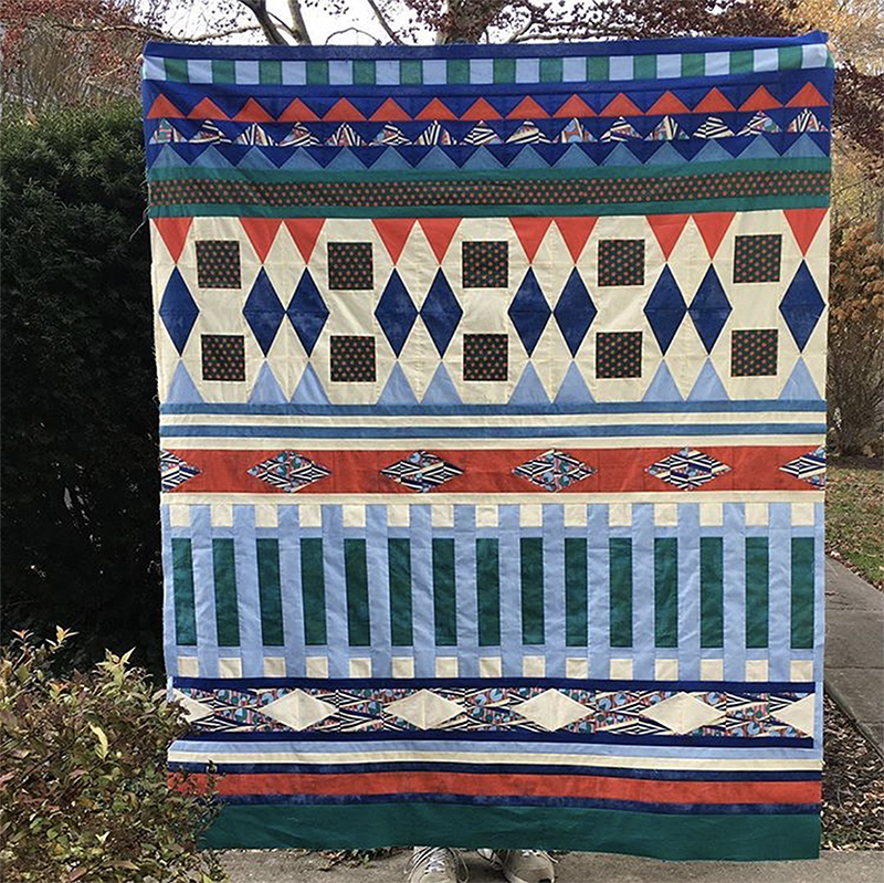 Above is the illustration that’s included in my Infrastructure Quilt Pattern. Here’s the basic idea: choose a decorative stitch on your sewing machine and quilt a series of lines across the quilt from one side to the other.