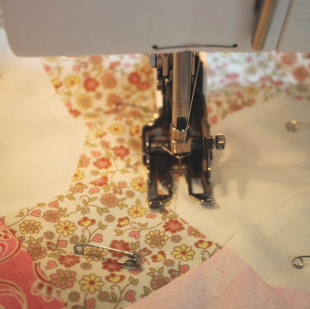 Using an open-toe walking foot really helps so you can see where you are stitching! Try to stay as close to the ditch as possible and slow down if needed so your stitches are straight and consistent. I only removed pins as they got in my way. I left the rest of the pins in for stability as I stitched.