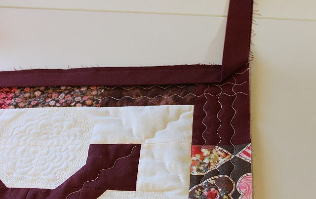 Some of the inner border will have already been quilted from outlining the blocks. I quilted the rest of the inner border seams and the outer border seam. This will stabilize the borders for now so I can add more decorative quilting later.