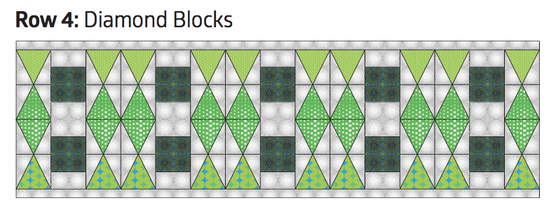 Follow along in the quilt pattern on pages 4, 6-7 and 10-11 to make Row 4. It’s sewn from Triangle in a Square blocks, fussy cut squares and background fabric.