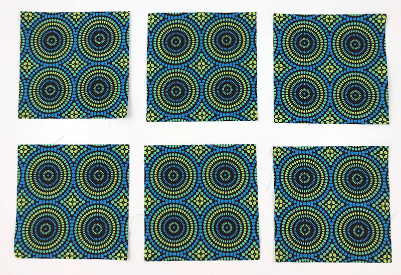 I chose to the fussy cut the squares of green Mosaic Dots, but not the background fabric.