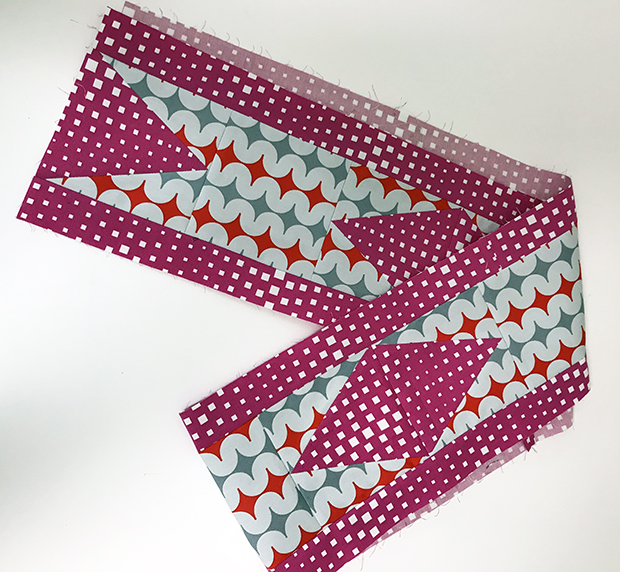 Sew the strips together end to end, mitering each of the corners so you get a long continuous strip. Cut one end at a 45 degree angle so the end and beginning are hidden. Then press the entire binding in half, wrong sides together.