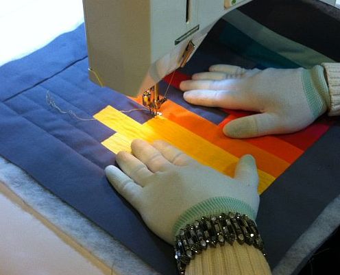 I stitched in the ditch through all of the seams first to stabilize them, then filled in each color with a fun design, changing thread colors as I went. I used a quarter to mark the circles.