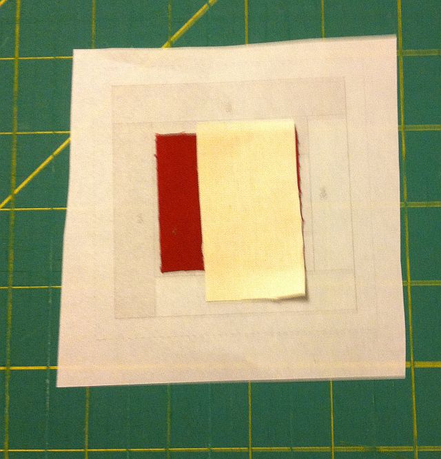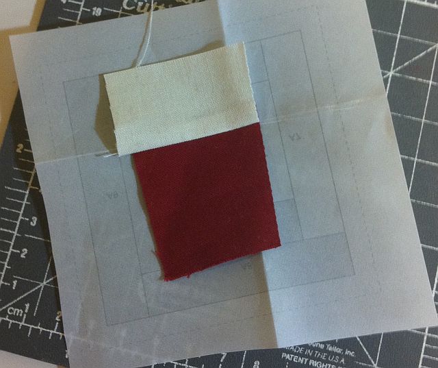 Line up your red square so that the BACK of the fabric touches the BACK of the paper. (Kind of tricky with solids – I know!) With right sides together, line up your first short white log on top of the red square, with about 1/4 inch overlapping your sewing line.