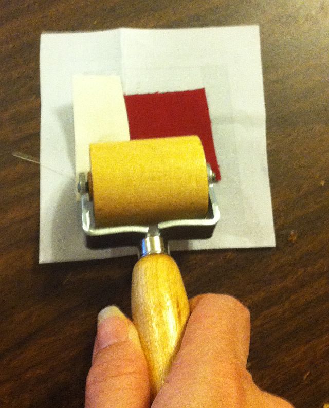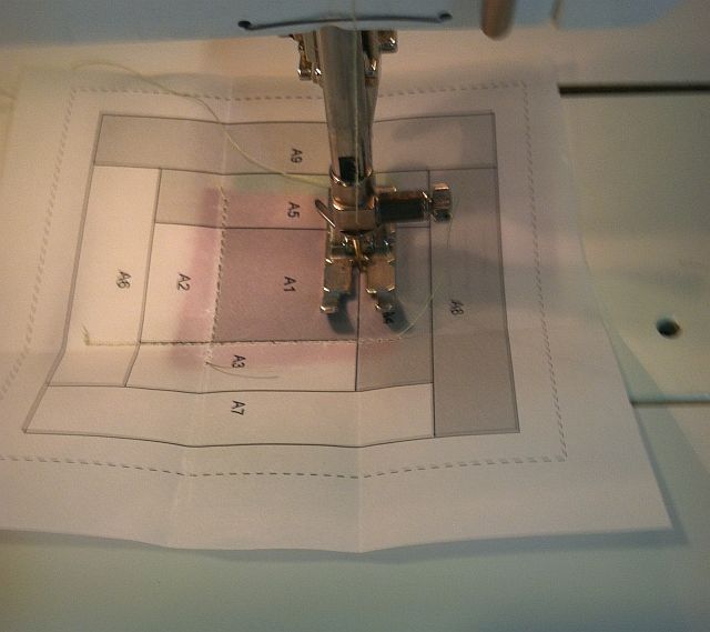Remove the block from the machine and clip threads. Use a wooden seam roller to press the newly sewn piece to the side. Flip the block back over to the front and using a straight edge (like a business card), fold over the paper on the next sewing line (between A1 & A3).