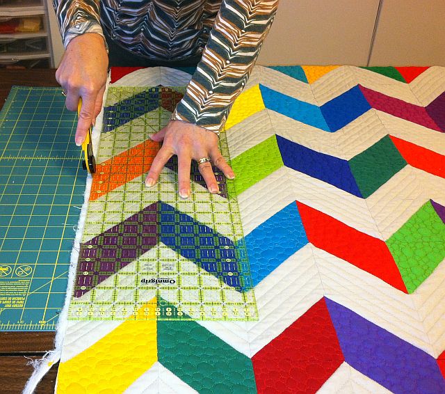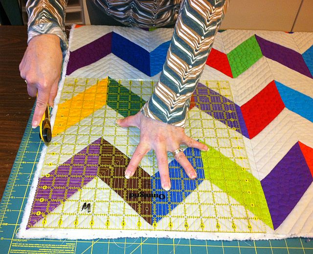 When the quilting has been completed and all of your basting pins removed, it’s time to trim the extra backing and batting and square up your quilt.