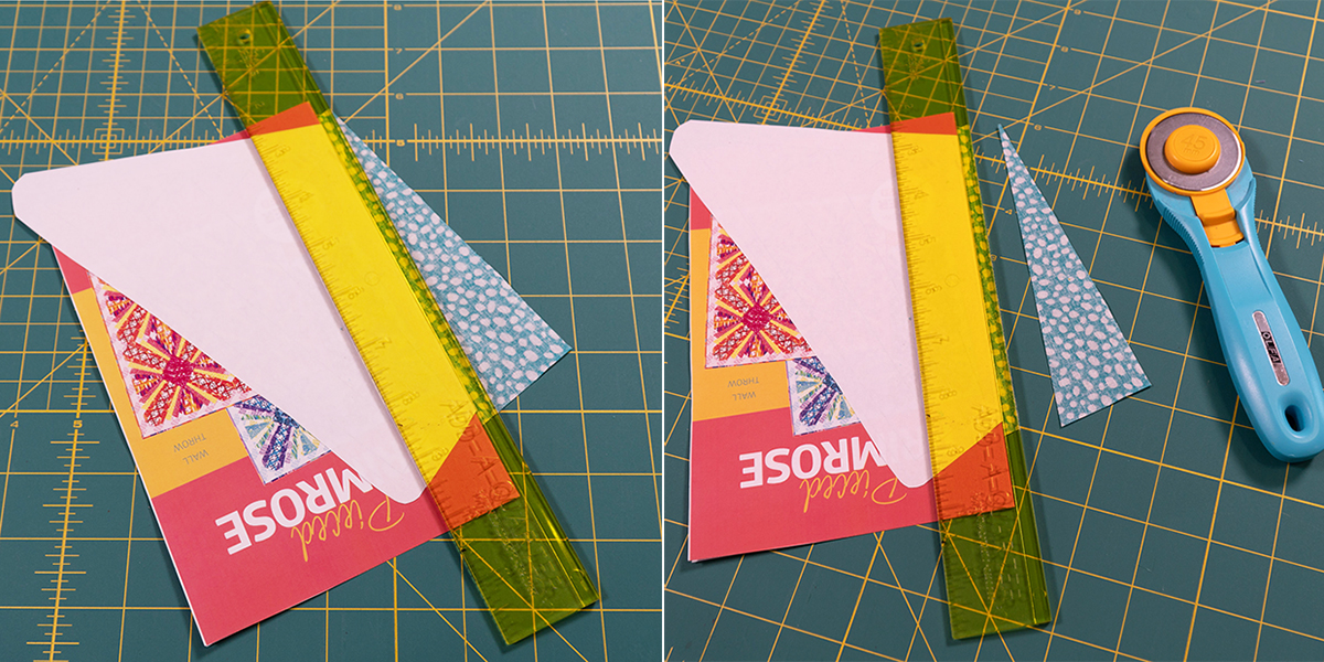 Once you’ve sewn all of the Section A and Section B blocks, trim them along the outer dashed lines using a rotary cutter and ruler. Be sure you don’t trim off your triangle points! At this point, your paper should still be intact to keep the blocks stable.