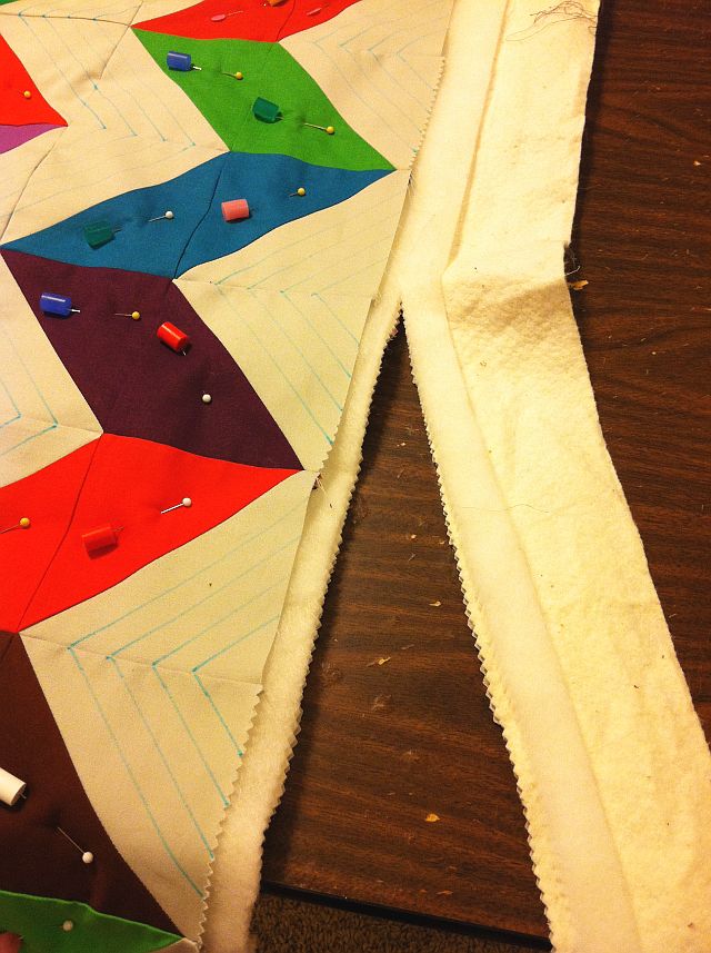 This is probably the trickiest part of the whole binding process. You want the ends to be joined with a nice miter seam that does not give any extra slack.
