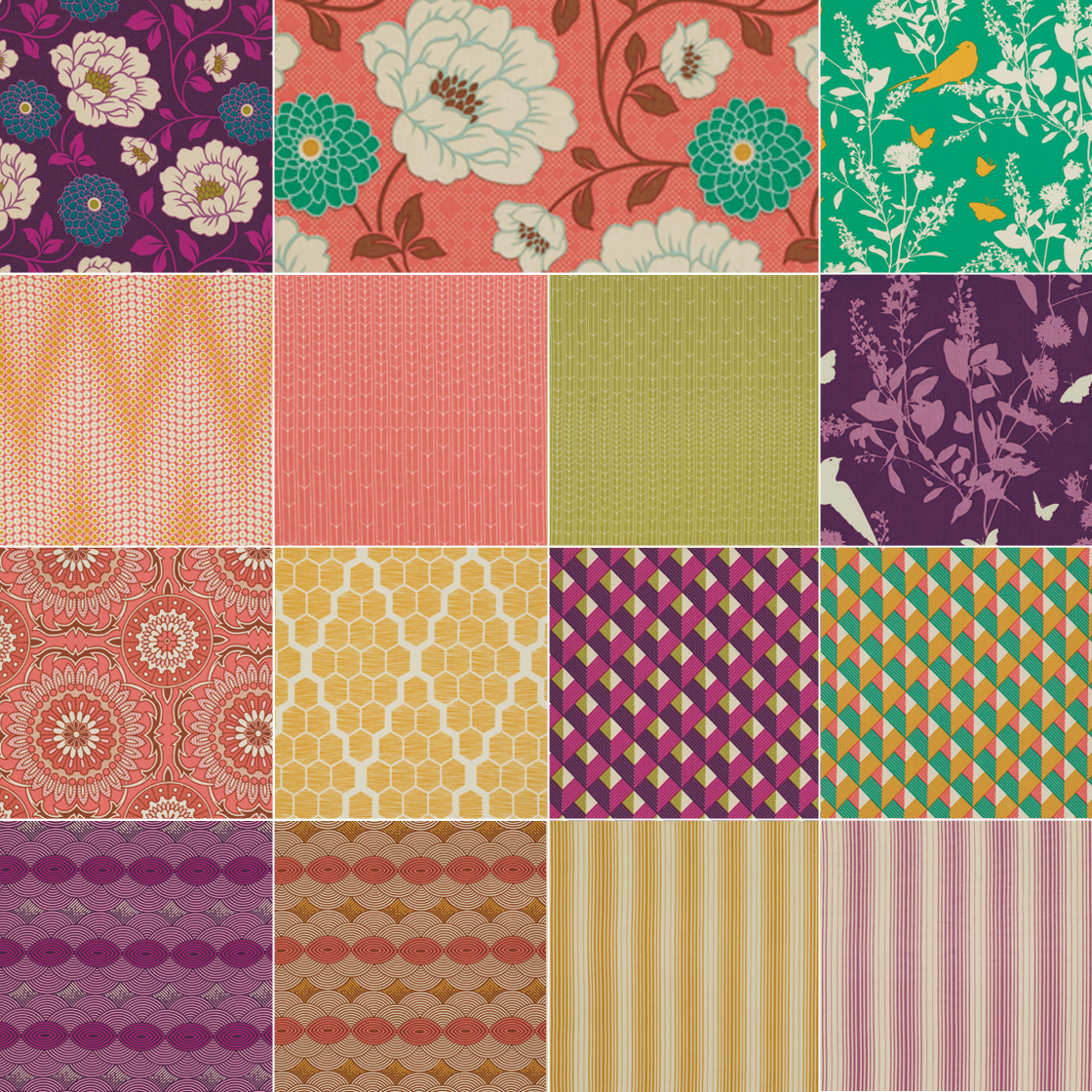 The full kit makes up into a generously sized 74″ x 90″ quilt and it includes the exact fabrics shown above to make the top plus binding. I’ve also put together a “starter bundle” featuring half yard cuts of the 15 Bungalow prints from the quilt.