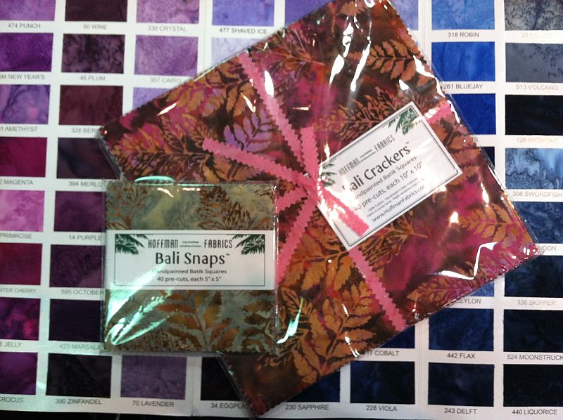 Along with fabulous shopping, I got a sneak peak of some upcoming Batik Charm Packs, Layer Cakes, and Jelly Rolls. Hoffman calls them Bali Snaps, Crackers, and Pops. Too cute!