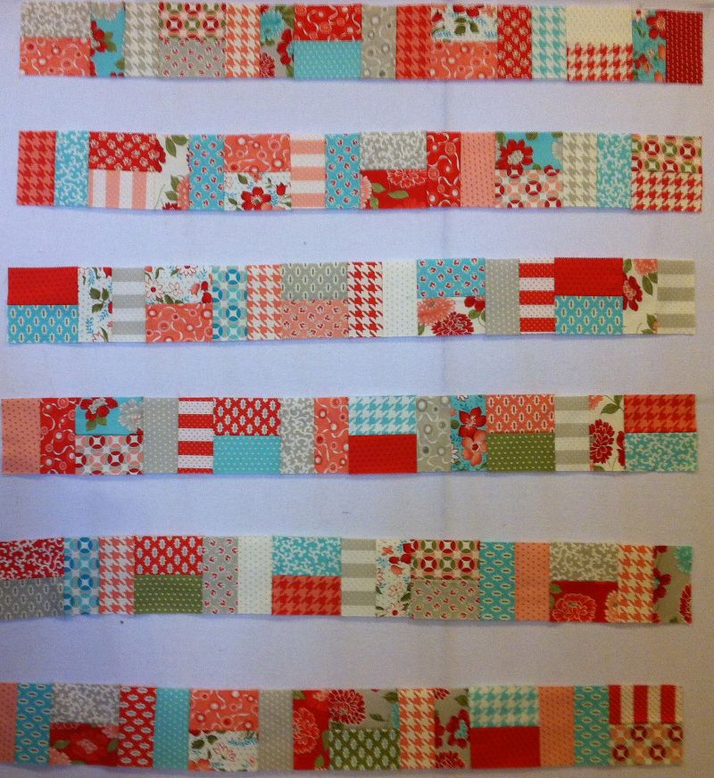 Sew the rows of blocks together into groups of two. I put each row up on my design wall to make sure I don’t have the same two fabrics touching. Join rows to complete the IQ.
