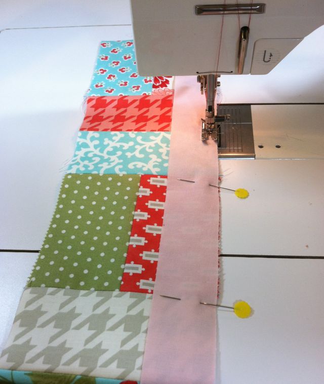 To make the rows line up properly, flip the border strip down so you can match up the seams. Use lots of pins to keep everything lined up straight.