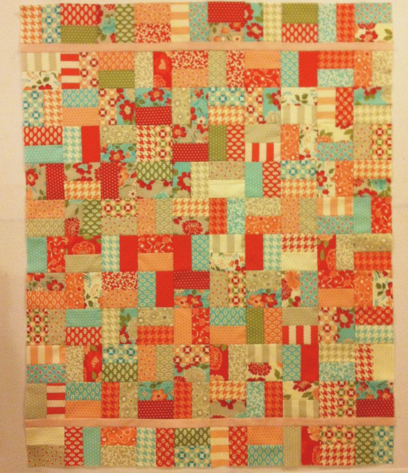 I used one Vintage Modern jelly roll by Bonnie and Camille with 1 yard of Kona Cotton Solids in flesh pink for my quilt top. I will pick out my backing fabric later this week and will use the remaining blocks to add a little interest to the back of my quilt.